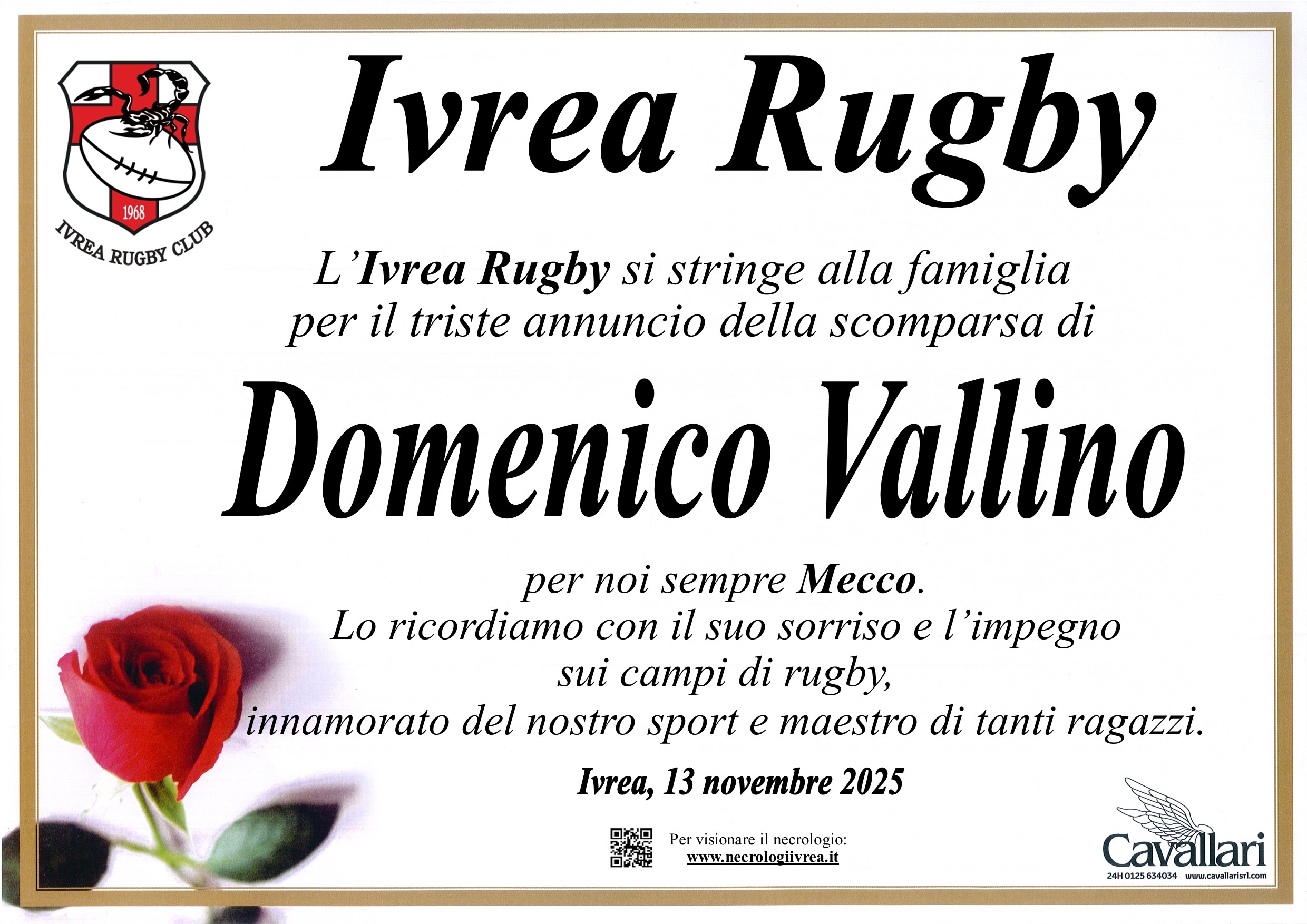Ciao Domenico, sei sempre stato una roccia e uno sportivo esemplare!! Il rugby, sport che hai tanto amato e praticato che poi, per raggiunti limiti di età lo hai abbandonato ma, deciso di insegnarlo sul campo e, ancora meglio, insegnarlo nelle scuole ai ragazzi con la speranza che potessero emularti.....Ti ha sempre fatto onore lasciando così a tutti un bellissimo ricordo!! Ora, dopo aver lottato come un leone, il destino crudele ha voluto che volassi in cielo... Sicuramente troppo presto... però, sono certo, che con la tua bontà e la Tua saggezza, continuerai ad insegnarlo anche lassù!! Buon Viaggio Domenico.